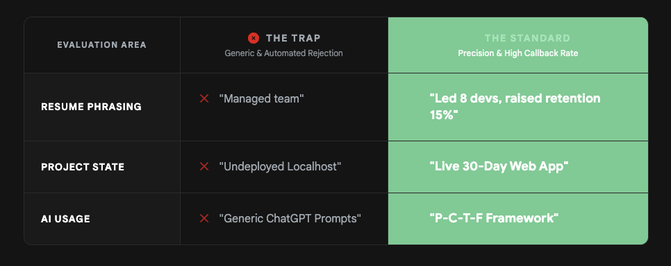 Eliminating generic AI usage and prioritizing live, measurable deployments separates successful candidates from the automated rejection pile.