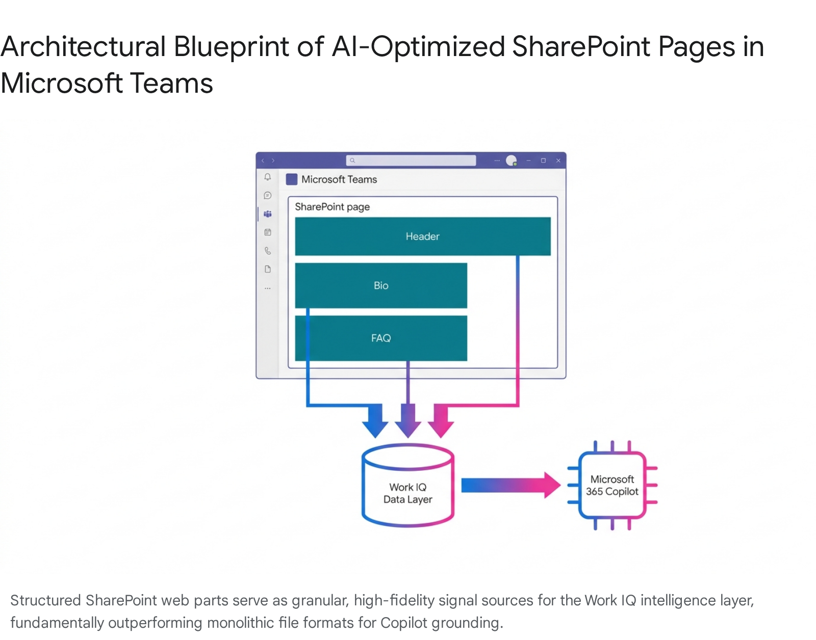 This evolution is driven by the introduction of Microsoft Work IQ, the foundational intelligence layer that powers Microsoft 365 Copilot and the broader ecosystem of Agent 365 deployments. Work IQ relies on high-fidelity signal extraction to understand organizational relationships, context, and intent. A static Word document provides a monolithic, relatively flat semantic footprint. In contrast, a modern SharePoint page—equipped with distinct text web parts, authenticated People web parts, and AI-curated FAQs—acts as a highly structured knowledge node.