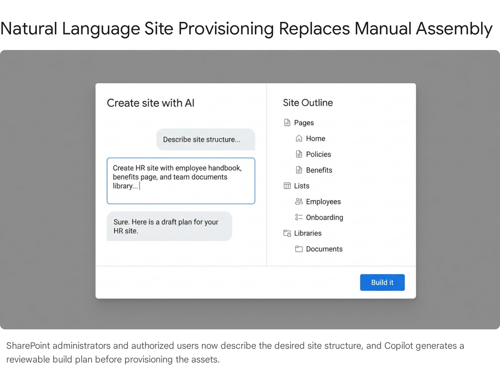 The original approach required manually selecting out-of-the-box templates, dragging and dropping web parts, and manually configuring navigation. This process was highly manual and required a baseline understanding of SharePoint page layouts. Today, manual assembly is no longer the standard. The approach now relies entirely on Microsoft 365 Copilot for Site Creation, the centralized SharePoint Brand Center, and the deployment of intelligent SharePoint Agents.