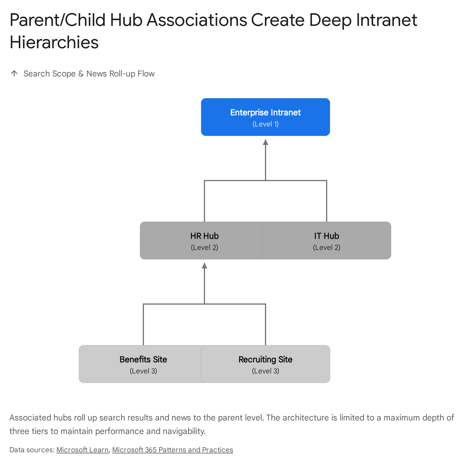 The 2026 standard utilizes Hub-to-Hub (Parent/Child) Associations. This feature allows organizations to nest hubs up to three levels deep. This creates a comprehensive search scope and rolls up news across complex, multi-divisional enterprises seamlessly.