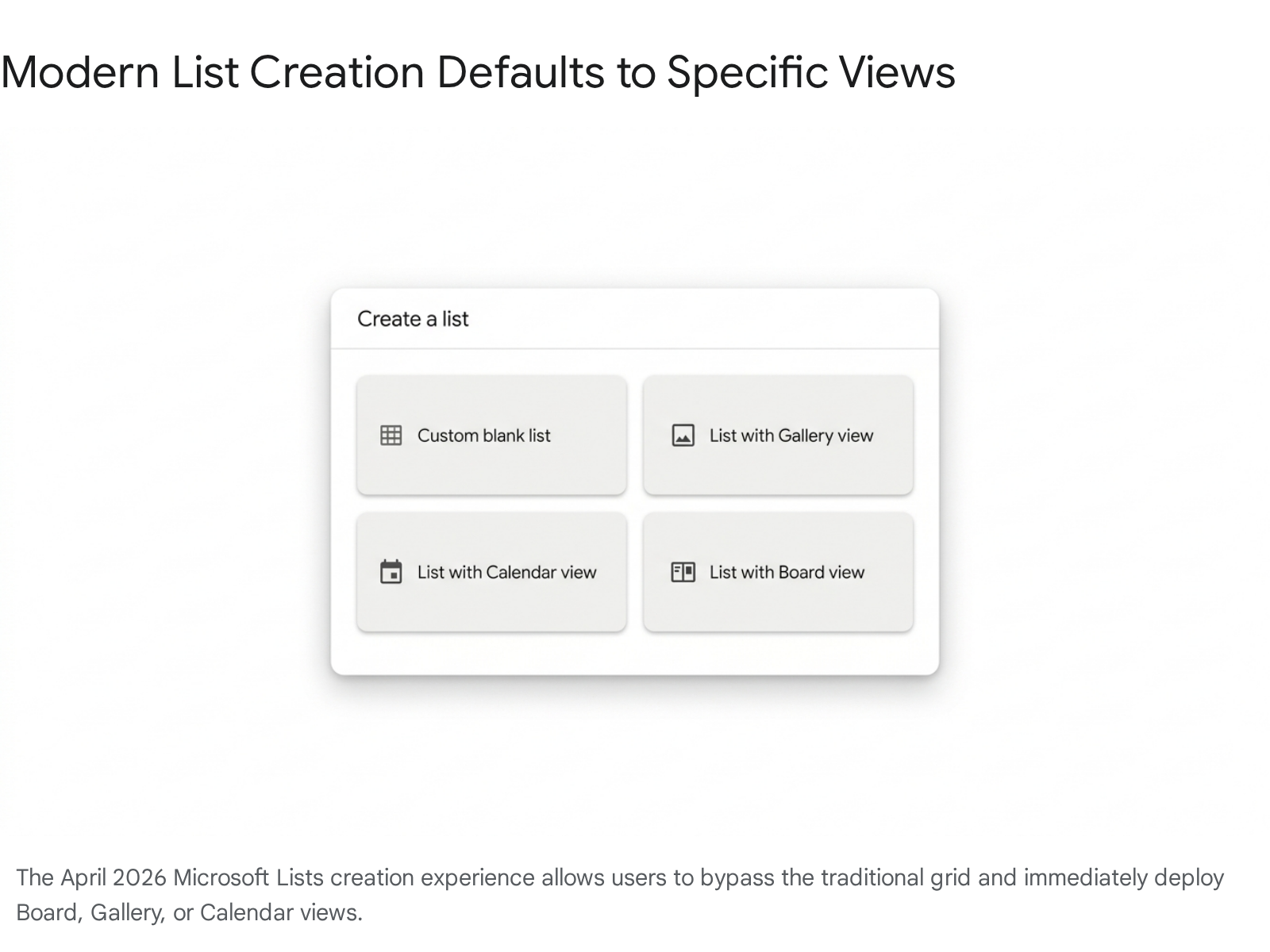 The list creation workflow has been fundamentally streamlined to reduce the time-to-value for end-users. Previously, users were required to instantiate a blank grid and subsequently build out specialized views. The April 2026 update to the Microsoft Lists interface fundamentally altered this sequence. You are now prompted to define the architectural view of the data at the moment of inception. This shifts the focus from database management to immediate data visualization.