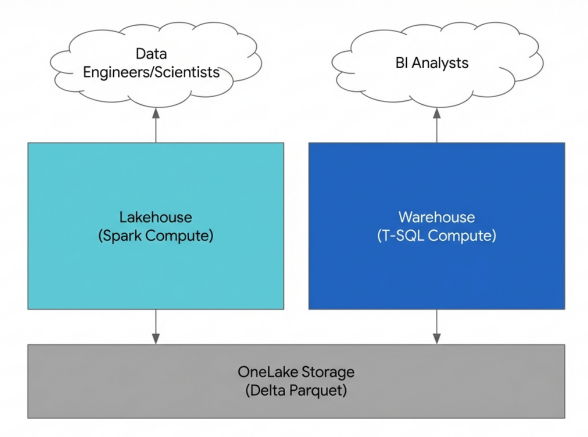 Both artifacts store data in OneLake using open Delta Parquet formats. The Lakehouse leverages Spark compute for versatile data engineering, while the Warehouse provides a dedicated SQL engine for structured analytics.