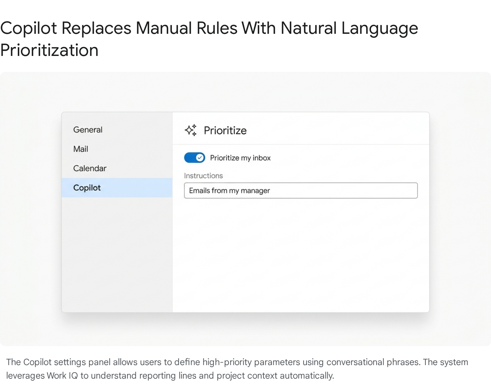 This feature represents a shift from static rules to adaptive learning. It is powered by Work IQ, Microsoft's intelligence layer that understands organizational context, reporting structures, and your historical collaborative patterns. Because Work IQ inherently understands your corporate hierarchy and ongoing project files, it requires far less manual configuration than legacy rules.