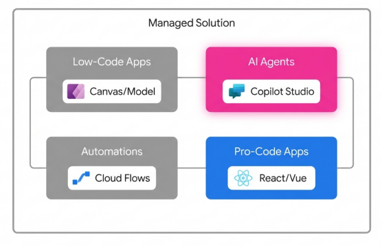 Solutions now act as enterprise containers, natively hosting Copilot Studio Agents and Pro-Code web applications alongside traditional low-code assets.