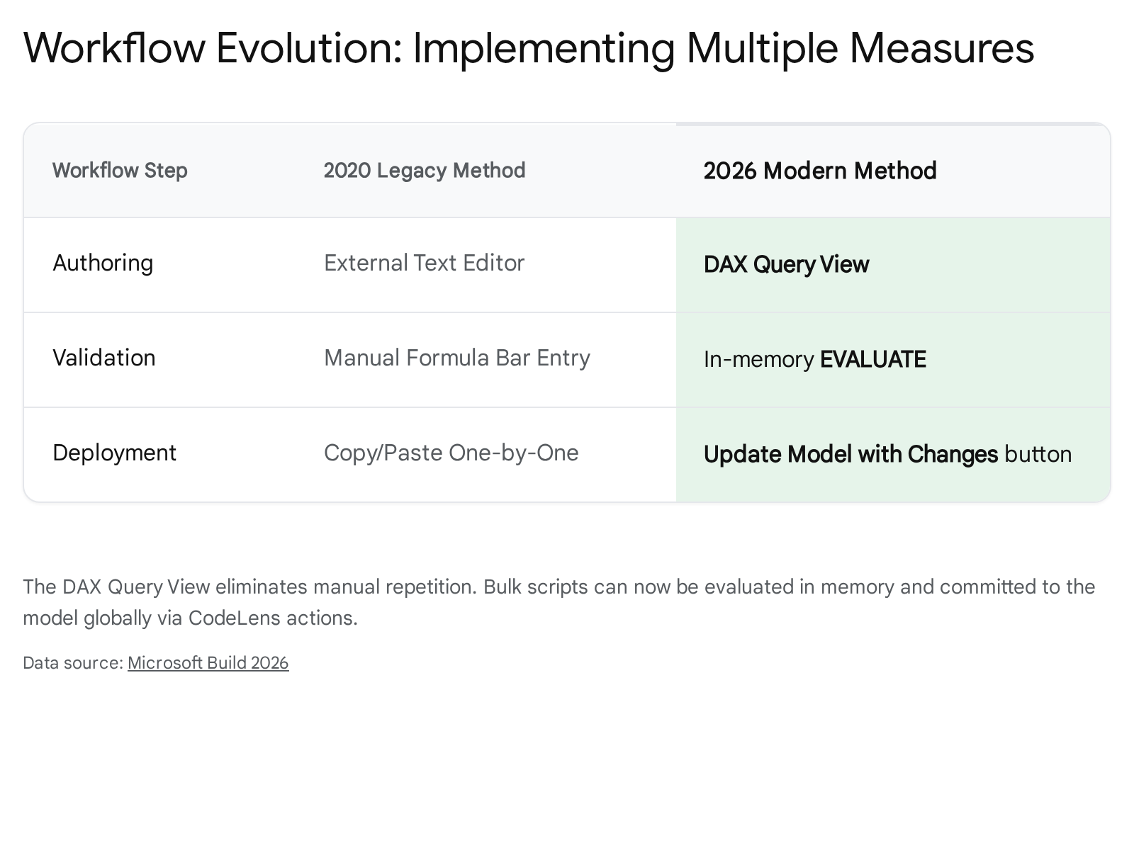 | Copy/Pasting Text Files | Obsolete | "Update model with changes": Push DAX directly from Query View to the semantic model with one click. |