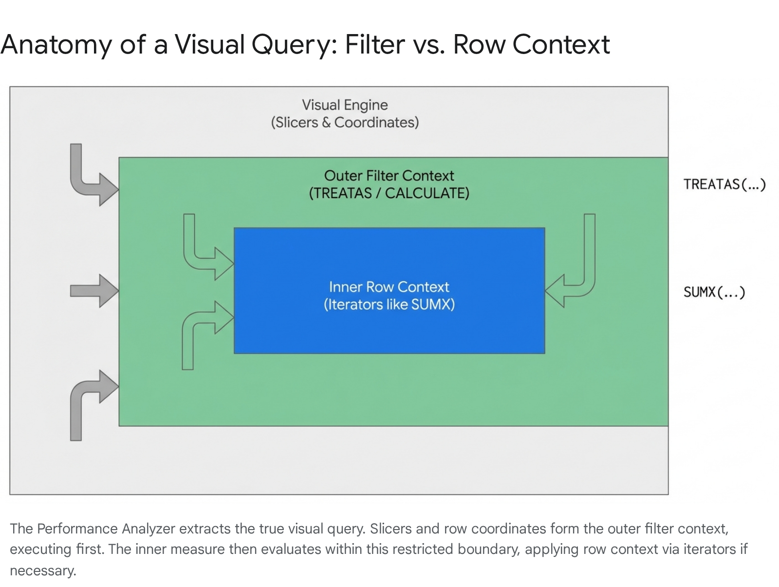 Quick Win: Never guess visual context based on report canvas behavior. Always use the "Run in DAX query view" button from the Performance Analyzer. It extracts the hidden outer filter context generated by slicers and page filters, making the invisible engine logic completely visible.
