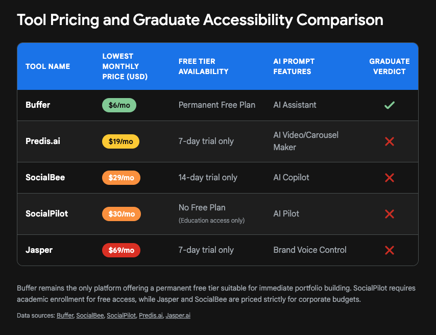 You are bombarded daily by targeted advertisements for social media management tools. These ads promise that their AI features will automate your workflow and guarantee viral success. As a graduate building a portfolio, you must ignore the marketing hype. You must look strictly at the numbers. Only two categories of tools exist for your specific situation. There are tools you can afford. There are tools built for agencies that will drain your bank account.