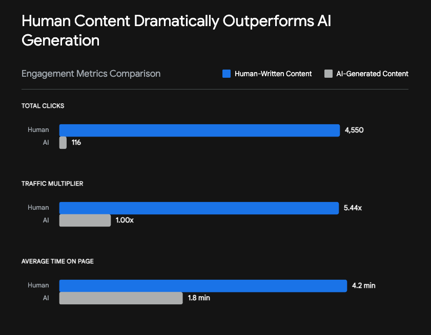 A 2024 study tracking search and social performance compared unedited AI content against human-written content. The results were stark. Human-written content received 39 times more clicks than the AI-generated alternatives.Specifically, human content drove 4,550 total clicks compared to a miserable 116 clicks for the automated content.