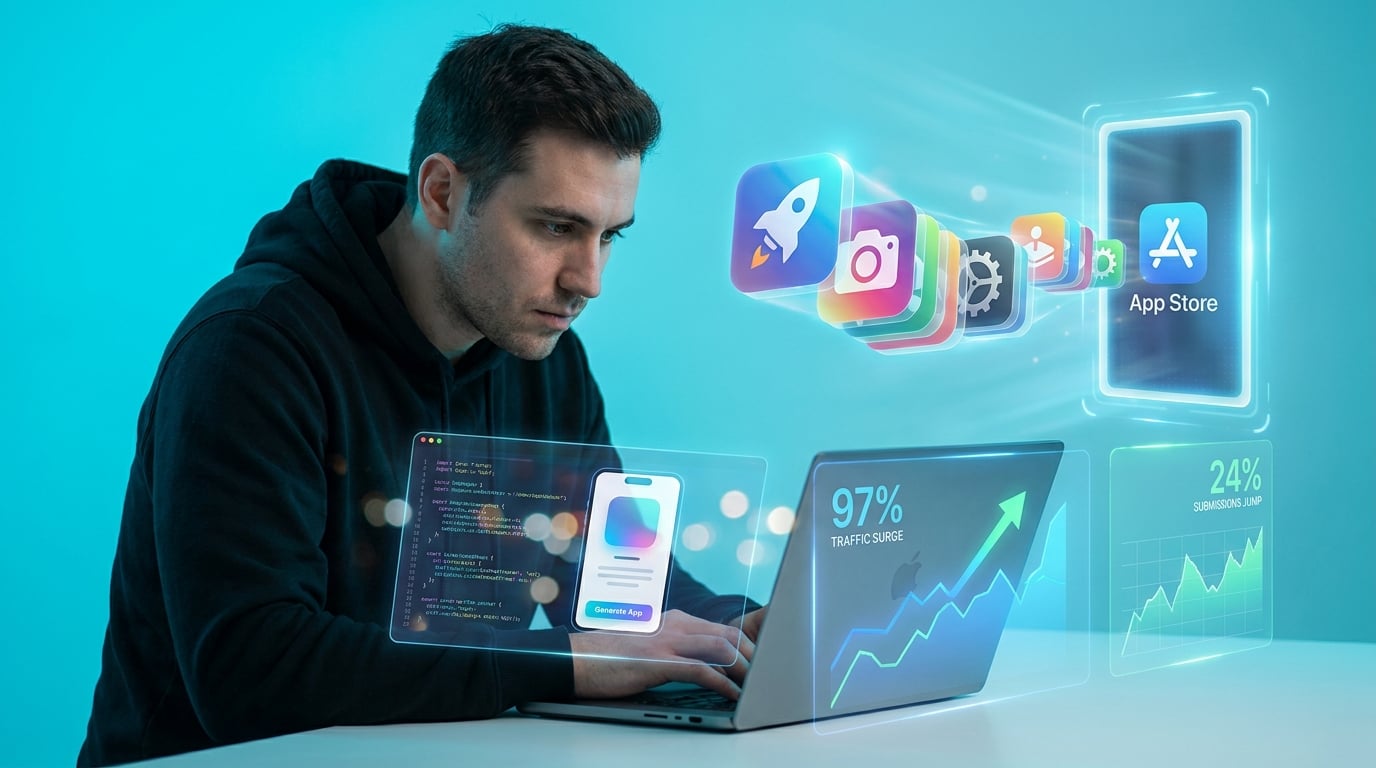 Traffic to top vibe coding platforms including Cursor and Bolt jumped 97% from 2.14 million to 4.22 million visits between August and February. Apple's App Store received 557,000 new app submissions in 2025, up 24% from the previous year and the biggest increase since 2015. Vibe coding, where AI handles most code from natural language prompts, has lowered barriers to app creation, shifting focus from technical skills to creative ideas.