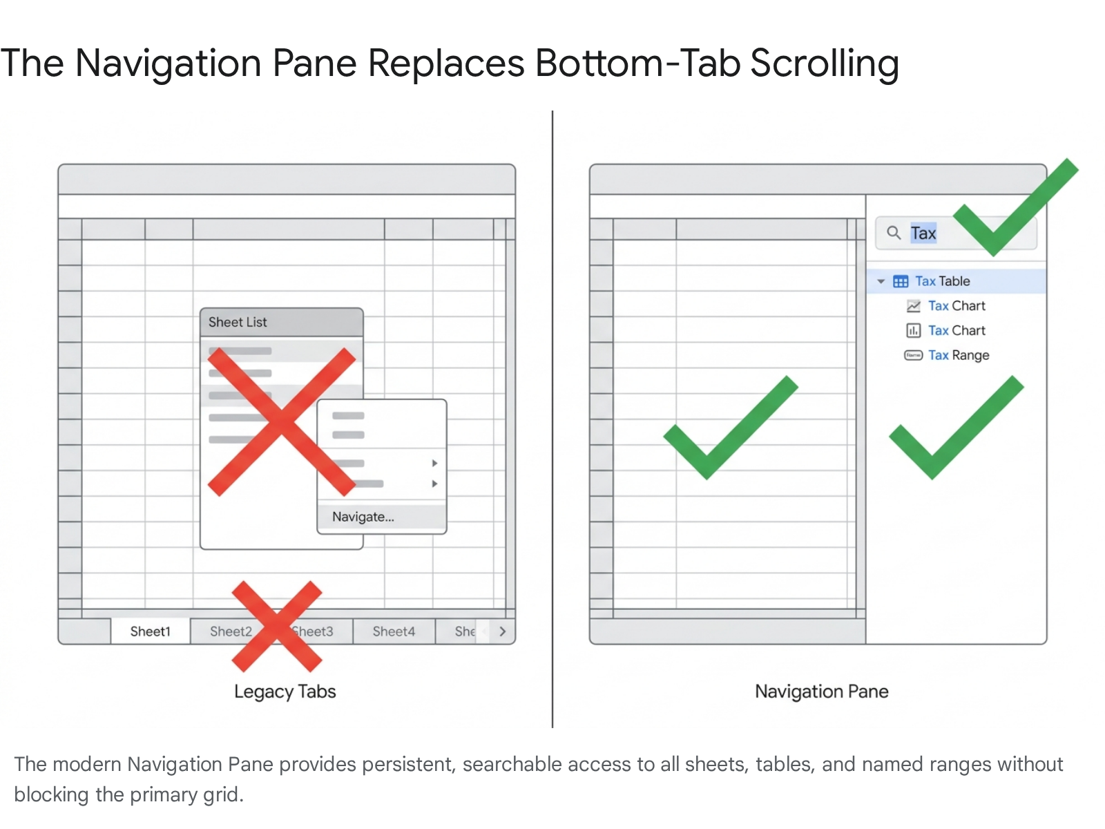 | Right-Click Sheet Arrows | Legacy / Obsolete | Navigation Pane (Persistent structural search). |