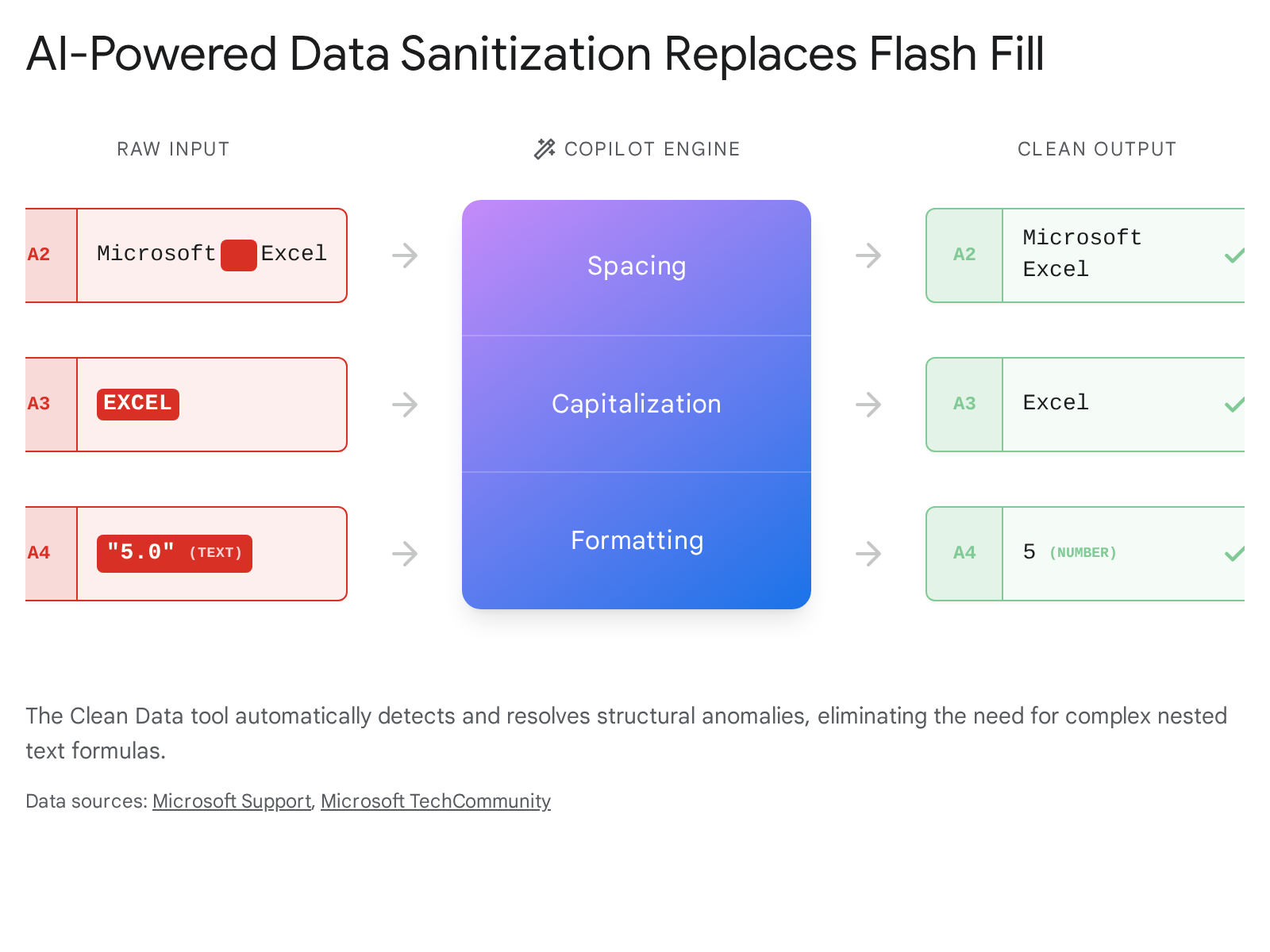 The 2026 standard for data sanitization is the AI-powered Clean Data button, deeply integrated into the Copilot ecosystem. This feature detects inconsistencies autonomously without requiring manual prompting or pattern establishment.