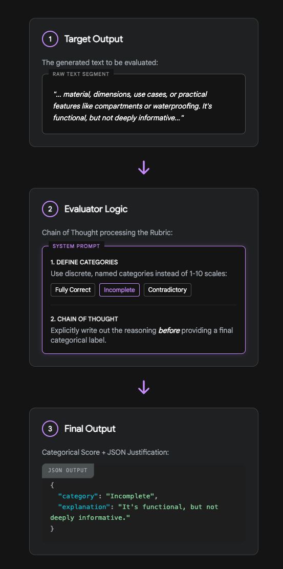 Furthermore, every evaluation must incorporate Chain-of-Thought (CoT) reasoning. The LLM judge must be explicitly instructed to write out its reasoning and map the generated output against the rubric criteria before it assigns a final categorical grade. This explicit reasoning instruction prevents silent hallucinations and allows the user to debug why a specific prompt failed to produce the desired result.