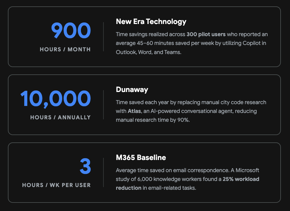 Data sources: New Era Technology, Dunaway (Microsoft Learn), Microsoft Work Trend Index 2025