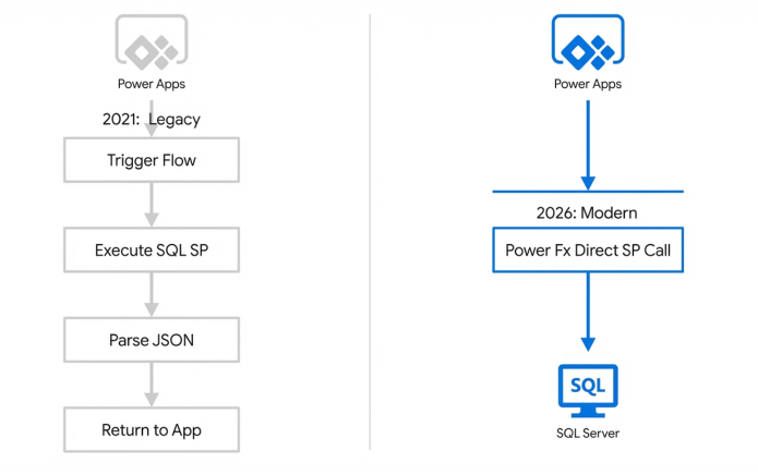 Native Power Fx stored procedure cells remove the need for intermediary Power Automate flows, reducing latency and avoiding data row limits.