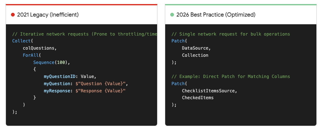 The March 2026 Build: The nested ForAll(Patch()) pattern is now considered a legacy anti-pattern. Power Fx has been significantly upgraded to support highly efficient bulk updates directly using collections. The platform also introduced new disambiguation operators to handle complex relational joins during these bulk operations.