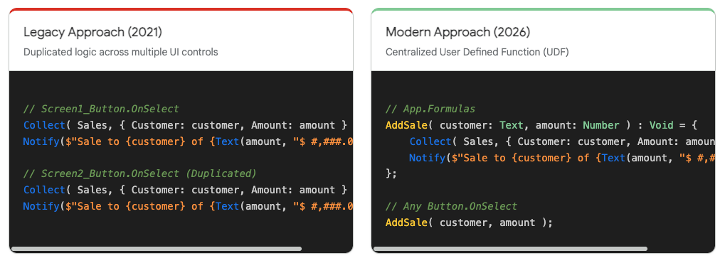 Historically, complex logic required duplicating lengthy If(), Filter(), or Patch() statements across multiple button OnSelect properties. This redundancy made enterprise applications incredibly difficult to maintain and debug. The modern solution to this architectural flaw is User Defined Functions (UDFs), which reached General Availability in early 2026.