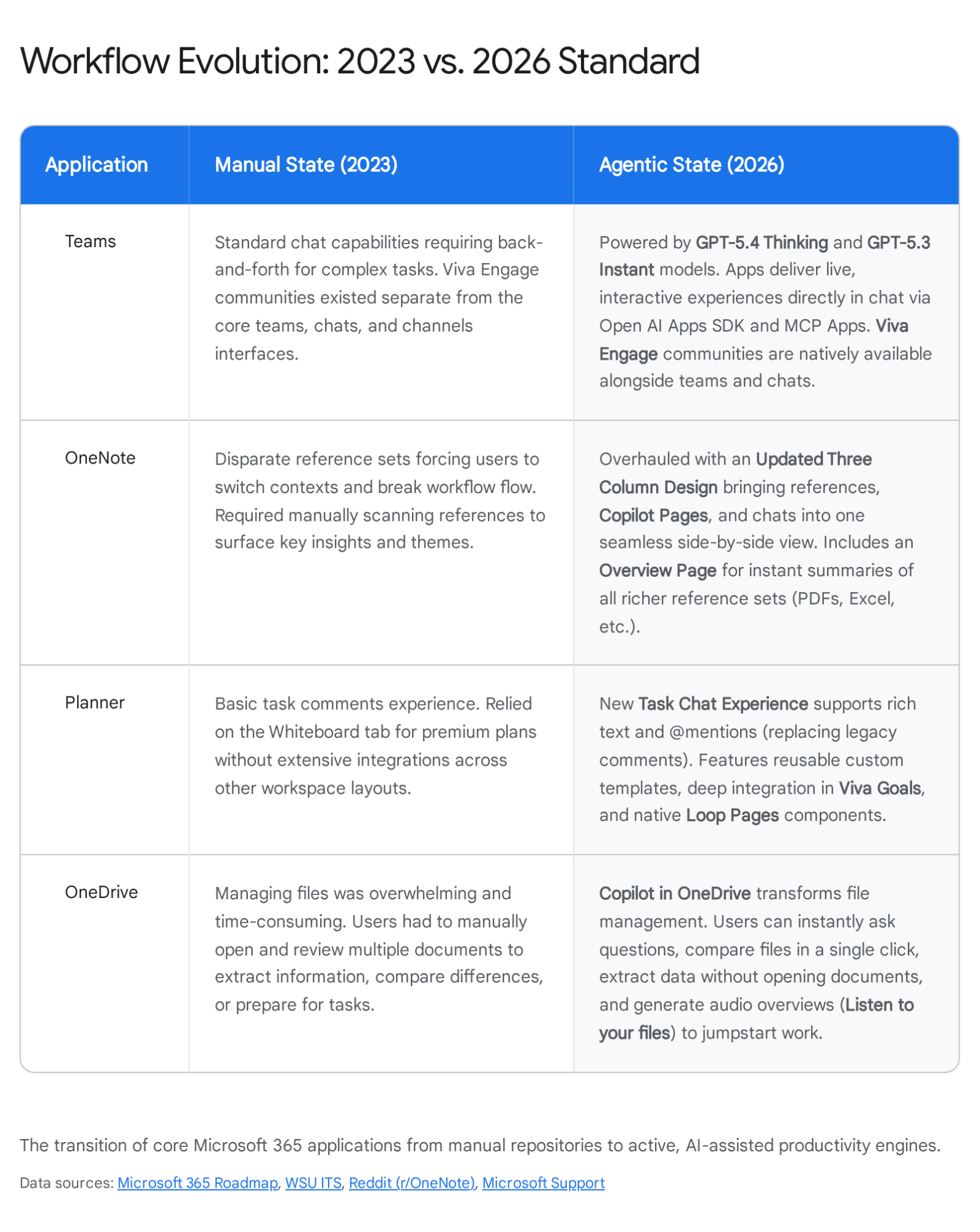 The historical data demonstrates a consistent upward trend in automation capabilities, evolving from the fragmented apps of 2023, through the initial Microsoft 365 Copilot integrations of 2024 and 2025, and arriving at the agentic execution paradigm of 2026. This evolution is now underpinned by the Work IQ intelligence layer, which connects organizational context across all workloads.