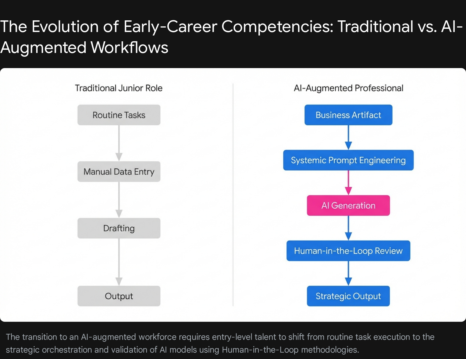 The aggressive proliferation of advanced automated systems and generative models in the global enterprise has not eliminated the need for junior talent; rather, it has permanently altered the baseline competencies required to enter the professional sphere. The 2026 labor market no longer rewards the rapid, manual execution of routine cognitive tasks, as these have been thoroughly commoditized by automation. Instead, it places a massive premium on strategic governance, process engineering, and systemic risk mitigation.