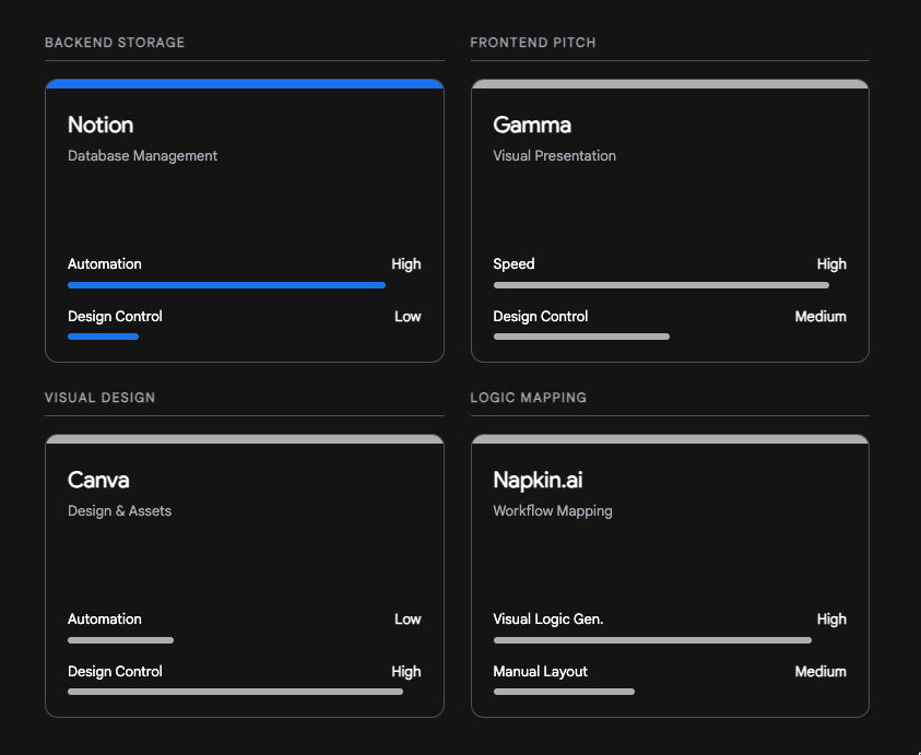 Notion serves as the foundational database for prompt libraries, while tools like Gamma and Napkin.ai are leveraged for presenting case studies and mapping cognitive workflows.