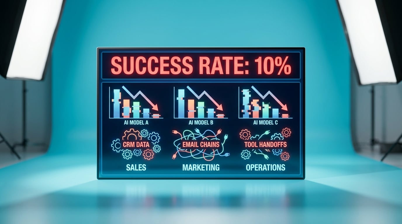 Forget chasing model leaderboards; this benchmark hands you sales gold – AI's 90% flop rate proves small biz ICPs need your consultative no-code fixes, not more hype. Pick one AutomationBench domain matching your niche research, like sales lead routing, and inject the 10% stat into your next 20 cold LinkedIn DMs as your UVP hook to book discovery calls.